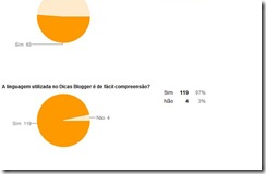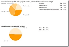 Quanto ao blog em si, a maioria chegou através de link em outros blogs. Os artigos preferidos são os hacks e os tutorias e 31 % gosta de tudo. :-) Entretanto 64 % deseja ver o fim das Salsas Digitais :-( A maioria não comenta no blog por falta de tempo e somente a metade acompanha os posts via feed. Para minha felicidade, 97 % considera nossa linguagem de fácil compreensão.